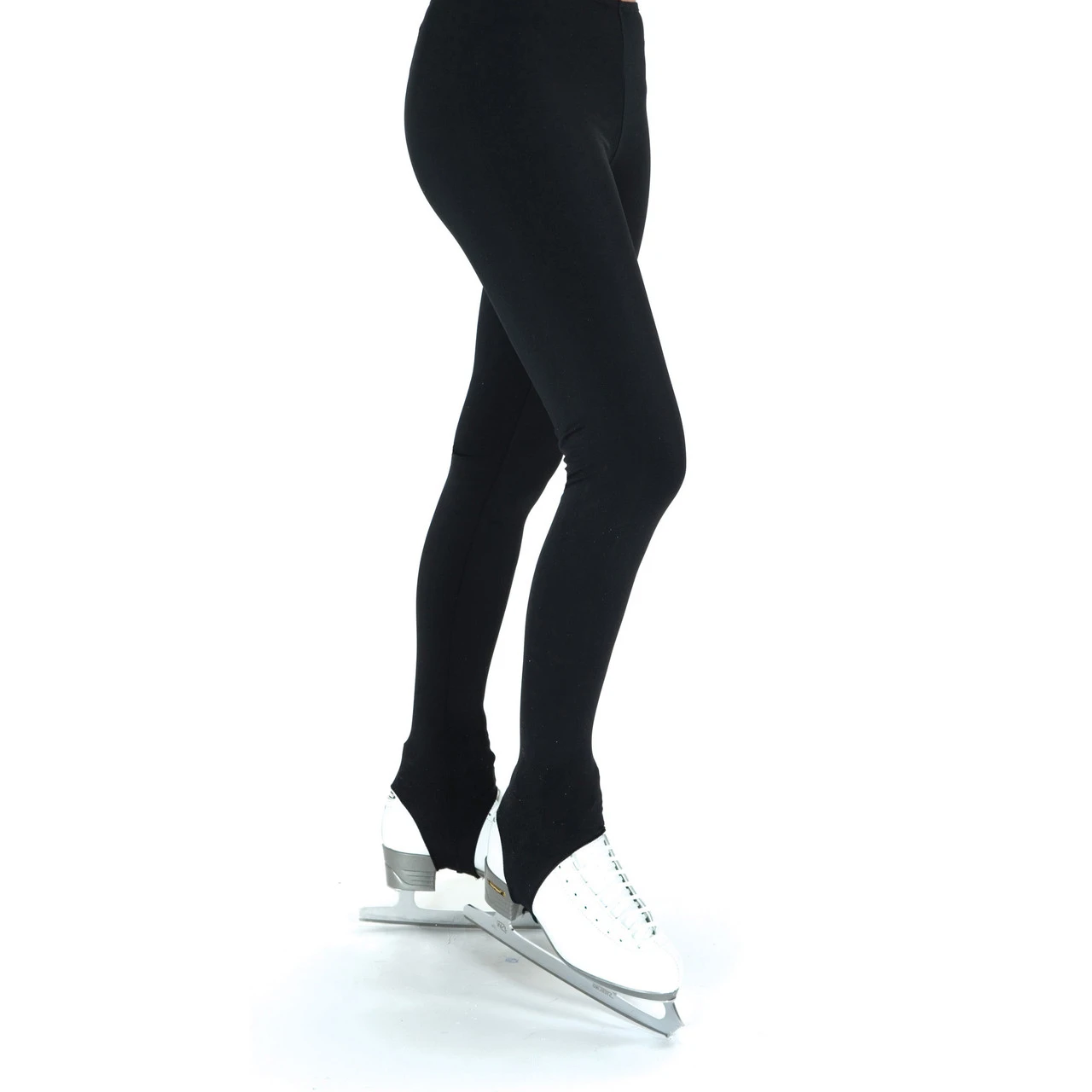 Black lycra leggings with an elastic waist and stirrups with clips.