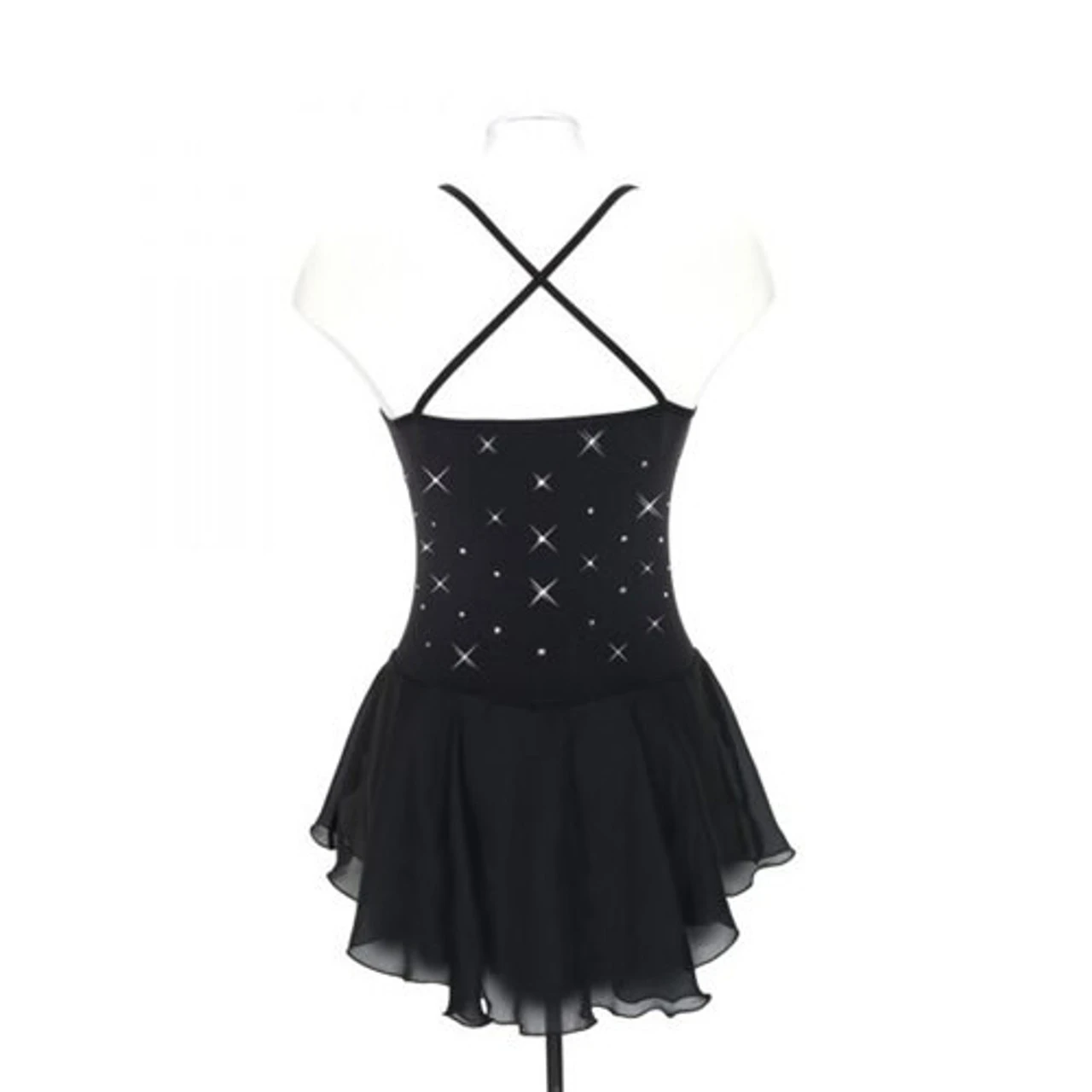 Black supplex dress with matching mesh accents at the front, scattered rhinestones, and a georgette skirt. Crossed back straps; lined.