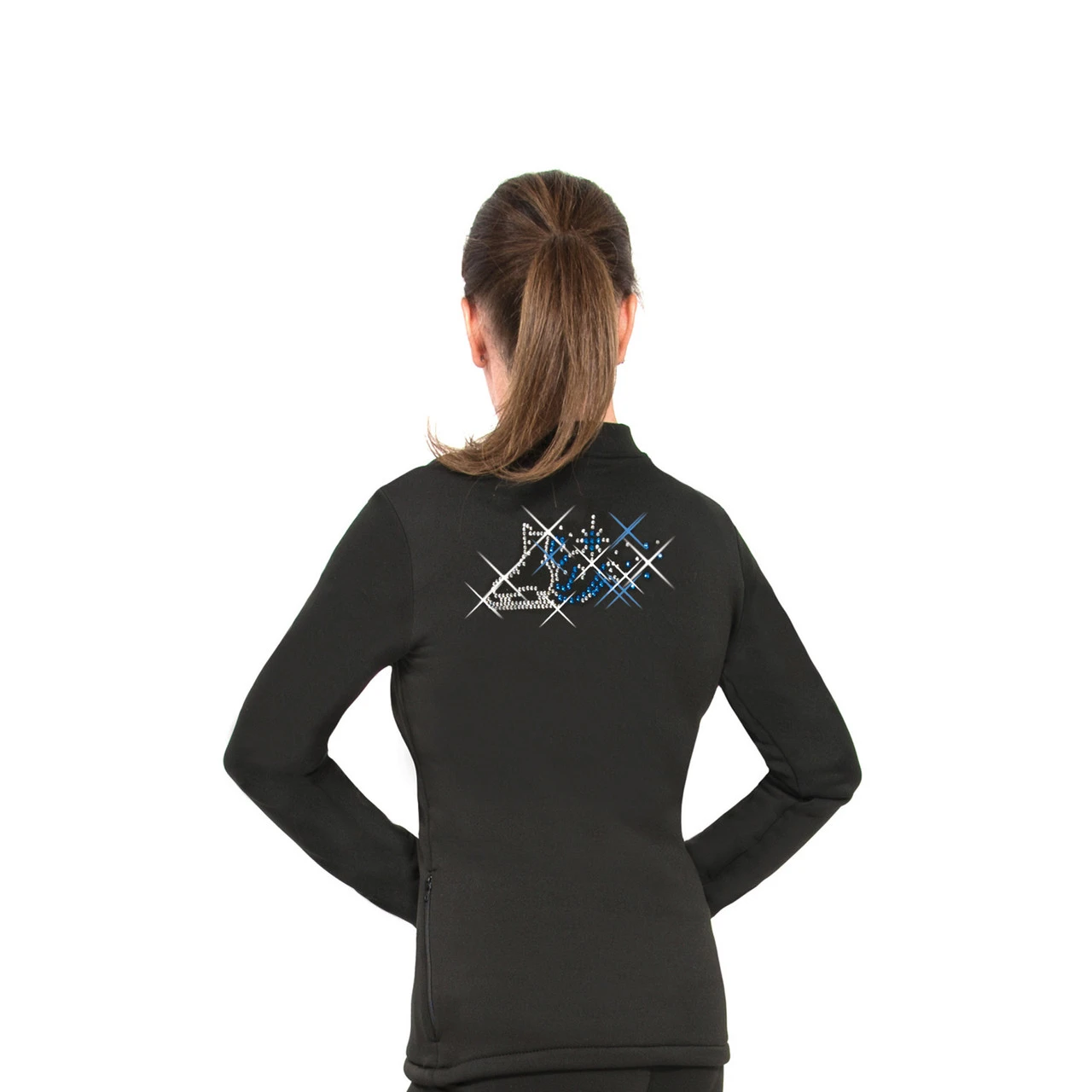 Full zipper jacket in warm fleece with a sparkling crystal skate and snowfall design across the back.