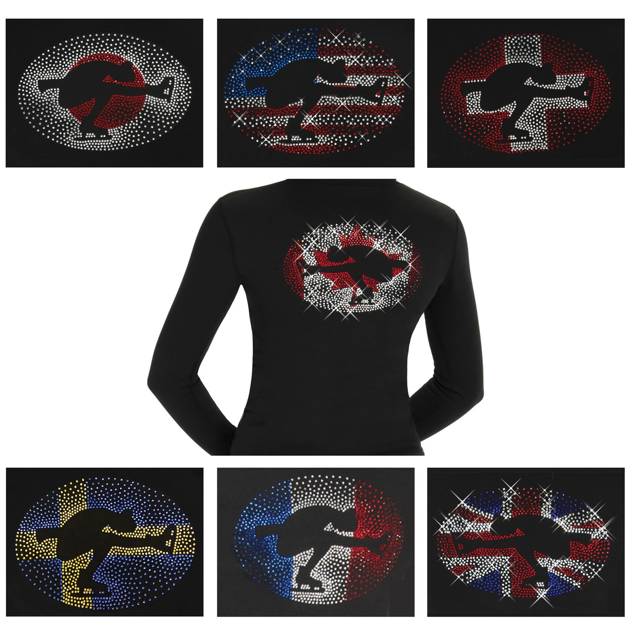 Jerry’s Skating World brings the world to figure skaters in every country. Flaunt your flag in our power fleece jacket with sparkling crystals outlining a sit spin silhouette against flags of all countries at the back.