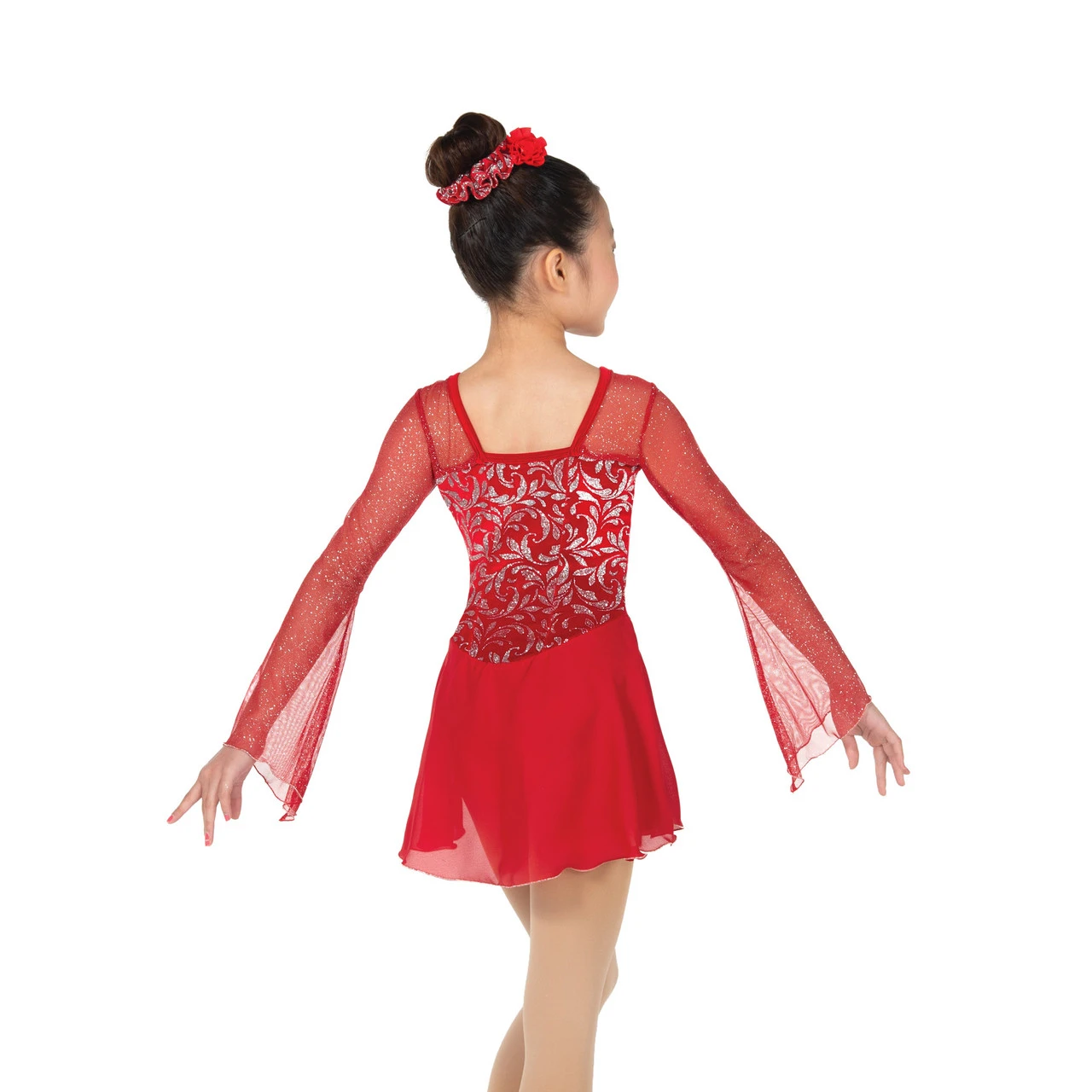 A rich red velvet dress with sheer glitter mesh flute sleeves, a square neckline and a georgette skirt with a longer hem and wrap styling that slants up at one hip.