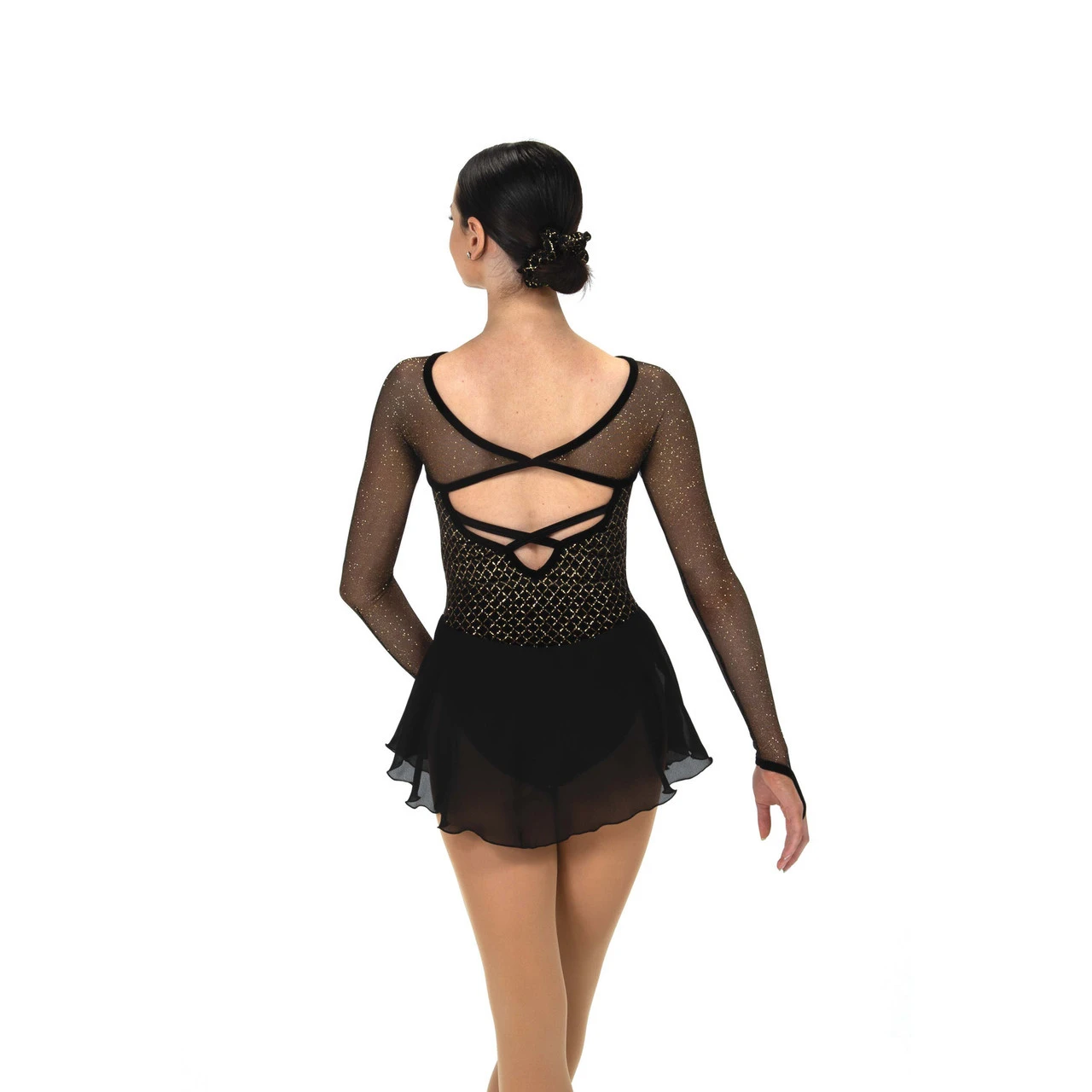 Gold diminutive diamond patterned velvet dress with long glitter mesh sleeves, a marquis neckline and diamond drop back with crossed straps.