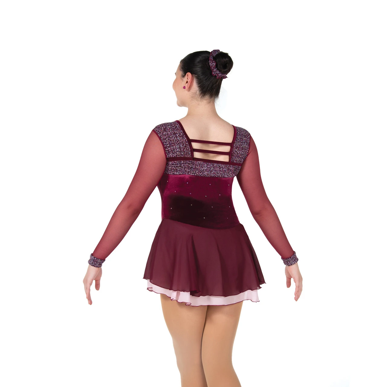 Velvet dresses in jewel tones with a square neckline at the front and back, a pair of parallel back straps, a double layer georgette skirt and a scattering of sparkling crystals.