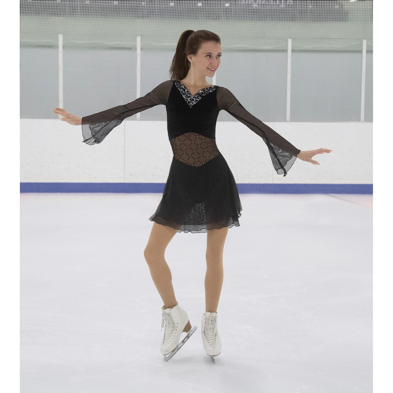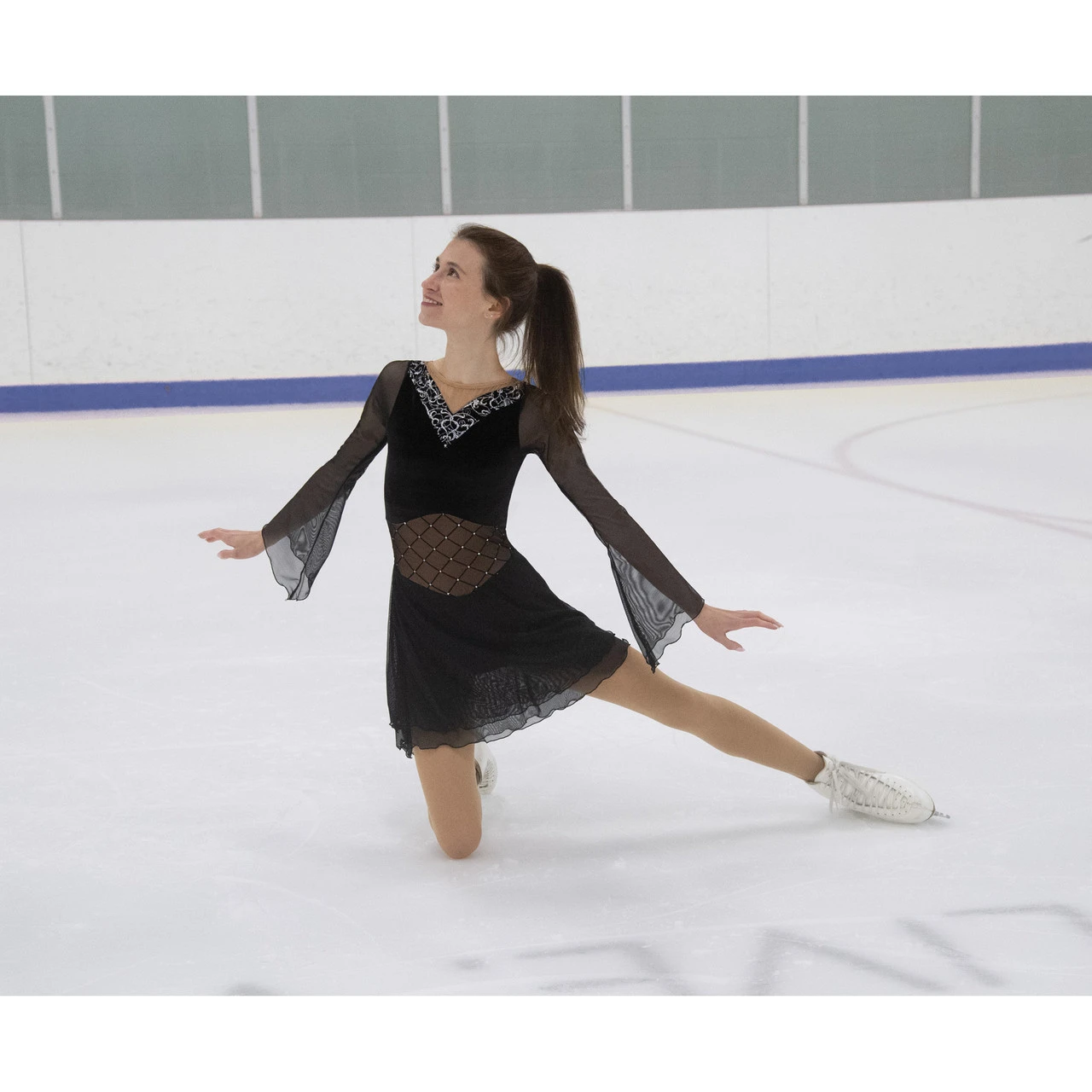 A style reminiscent of Hollywood’s glamour era, this is a jet black dress with a velvet bodice, shaped glitter trim at the neck, diamond pattern mesh midriff (fully lined for no show through!), fashionable fluted mesh sleeves, and a slim, slightly longer skirt of layered black mesh.